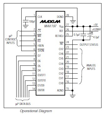The MAX197BCNI+ multi-range, 12-bit data-acquisition system (DAS) requires only a single +5V supply for operation, yet accepts signals at its analog inputs that may span both above the power-supply rail and below ground. This system provides 8 analog input channels that are independently software programmable for a variety of ranges: ±10V, ±5V, 0V to +10V, or 0V to +5V. This increases effective dynamic range to 14 bits, and provides the user flexibility to interface 4mA-to-20mA, ±12V, and ±15V powered sensors to a single +5V system. In addition, the converter is overvoltage tolerant to ±16.5V; a fault condition on any channel will not affect the conversion result of the selected channel. Other features include a 5MHz bandwidth track/hold, a 100ksps throughput rate, software-selectable internal or external clock and acquisition, 8+4 parallel interface, and an internal 4.096V or an external reference. A hardware SHDN pin and two programmable powerdown modes (STBYPD, FULLPD) are provided for lowcurrent shutdown between conversions. In STBYPD mode, the reference buffer remains active, eliminating start-up delays.